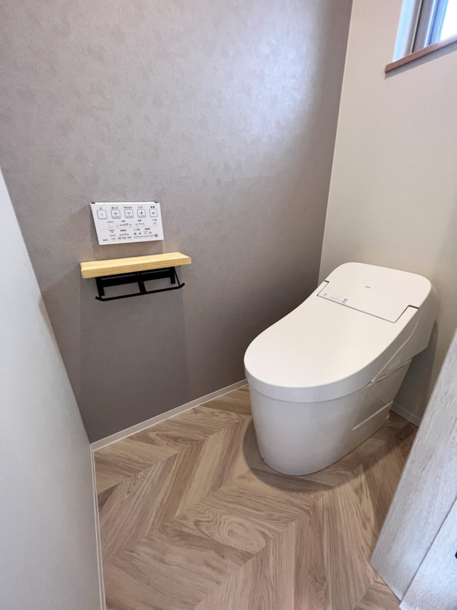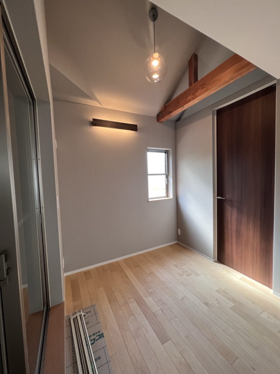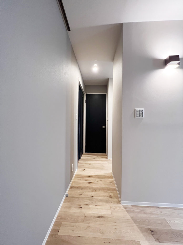 グレーのクロスと自然素材のフローリングを組み合わせることで、落ち着きのあるシックな印象になりました。