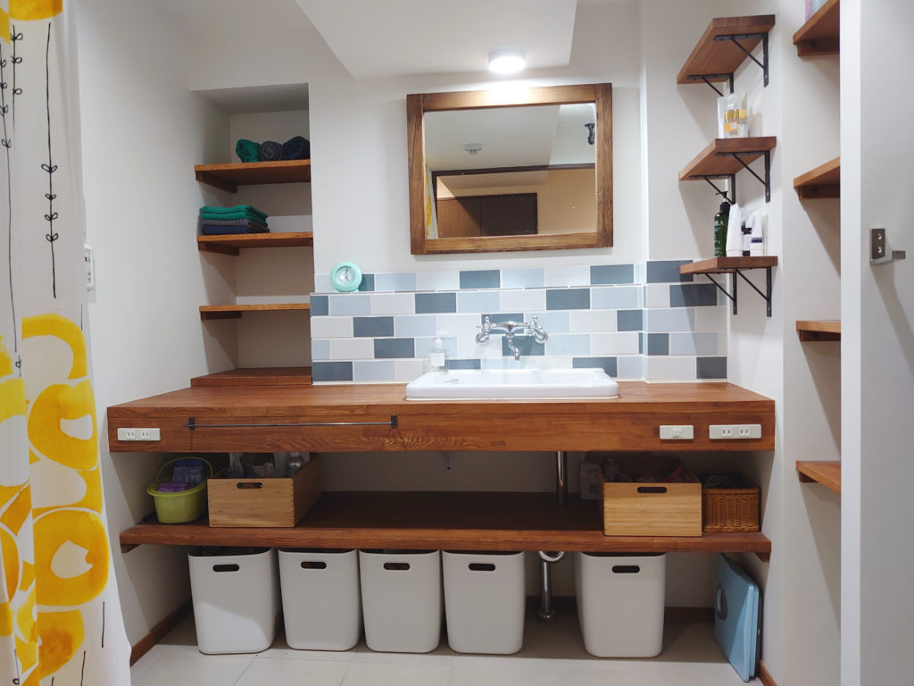 ここでも見せる収納を採用し、ものが溢れがちな水まわりもすっきりと清潔に保つことができます。