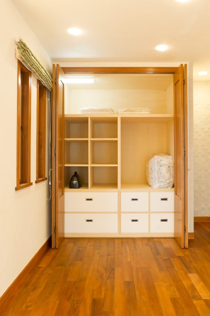 採光と通風を考慮しながらも、ウッドテラスとつながった過ごしやすい寝室、とのご要望でしたので、ライトを利用した空間の広がりを演出するプランをご提案させていただきました。