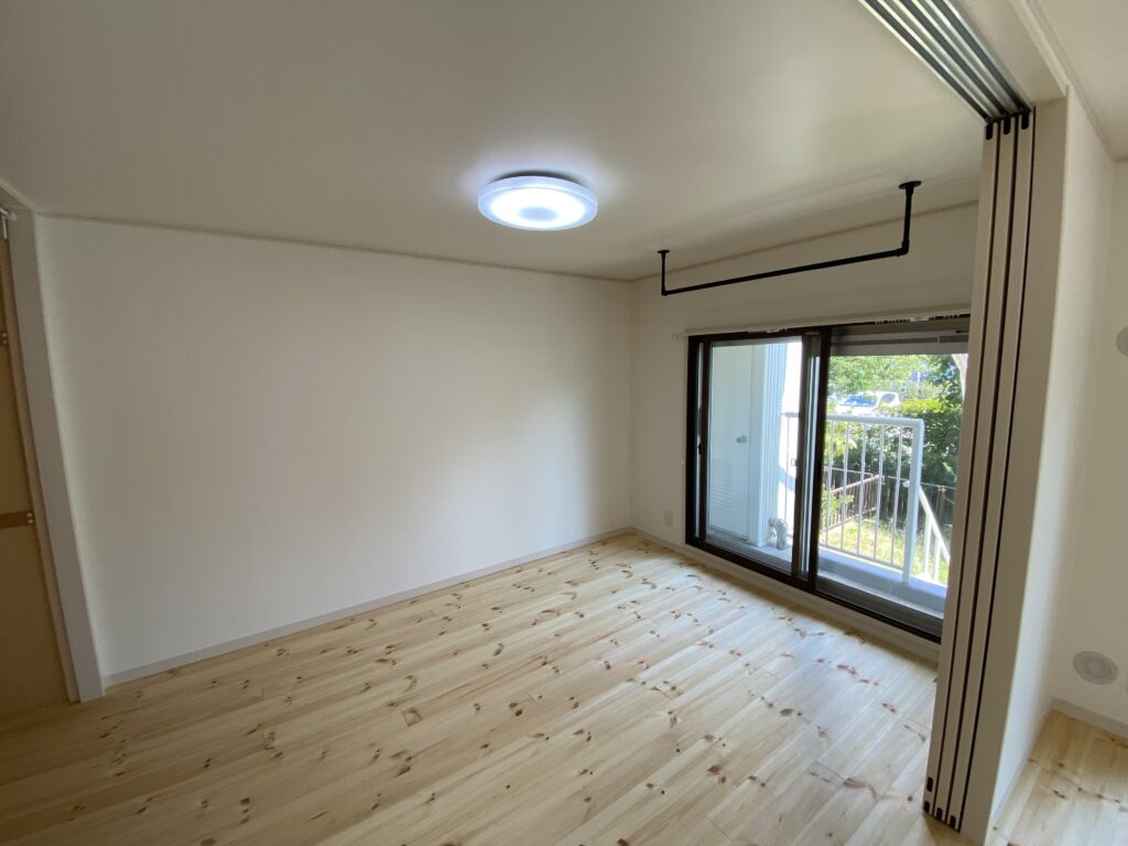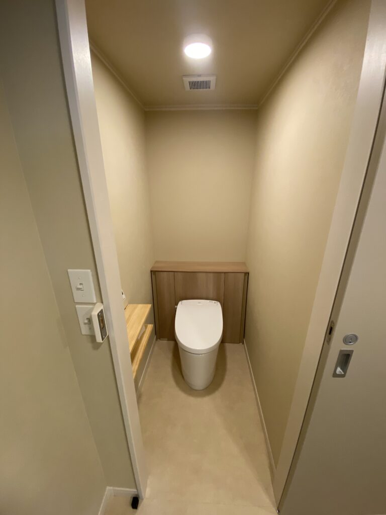 これらを踏まえ、玄関土間とつながる収納を新設し、玄関収納には有孔ベニヤを採用してフックで簡単に掛けられる便利なスタイルをご提案。洋室側からも使える収納を設け、生活動線の利便性を高めています。細長い形状の洗面室は出入口の位置や引き戸を工夫し、動線の煩雑さを解消しました。スイッチにはPanasonicクラシックシリーズを採用し、空間との調和を図っています。リビングには背の高い3枚引き込み戸を設置し、開放感のある広々とした空間を実現しました。