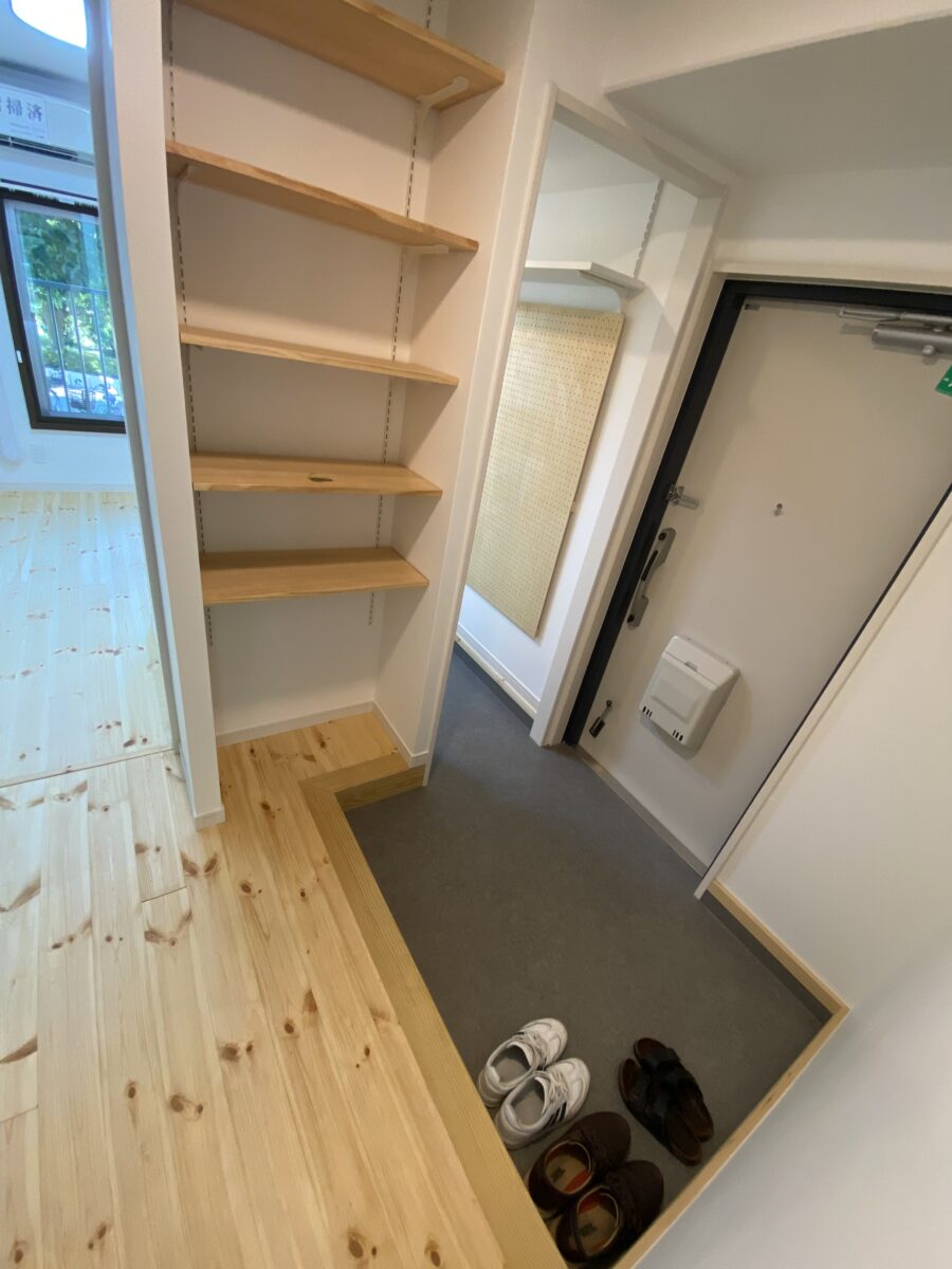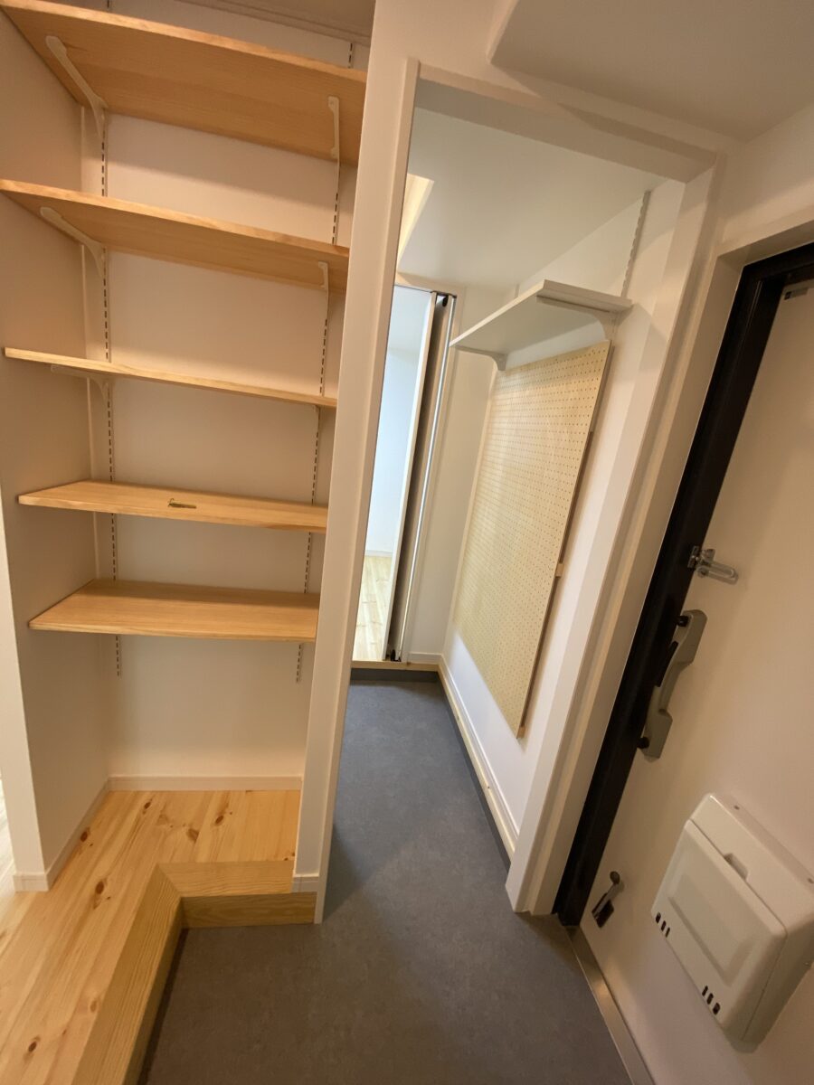 玄関土間とつながる収納を設け、玄関収納には有孔ベニヤを使用してフックで簡単に収納できる仕様をご提案しました。