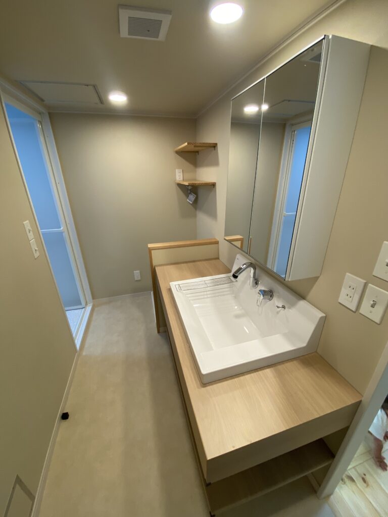 洗面室は細長い形状であるため、引き戸や出入口の開口位置を工夫し、動線の煩雑さを緩和する設計をご提案しました。