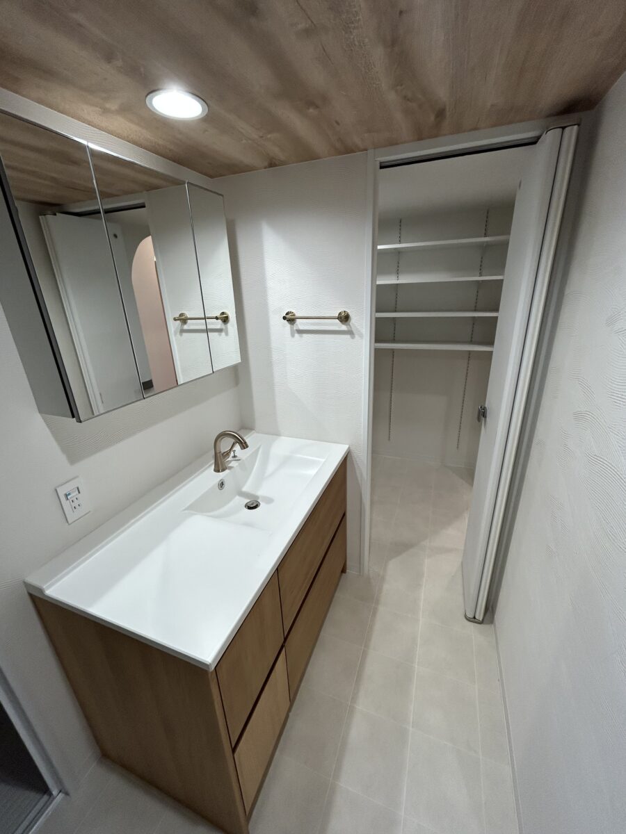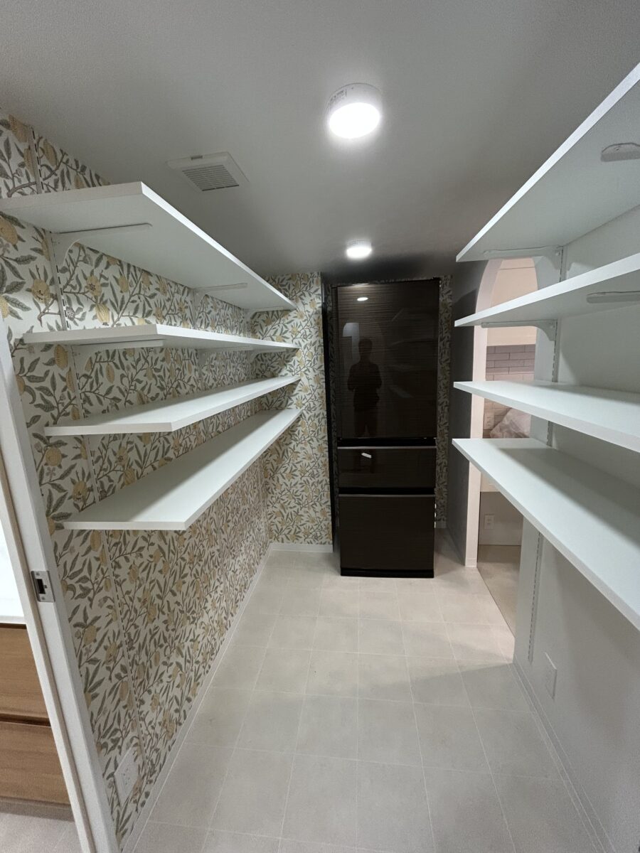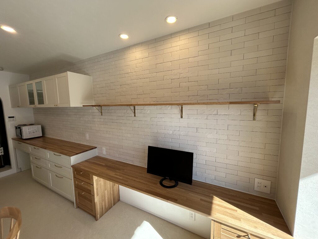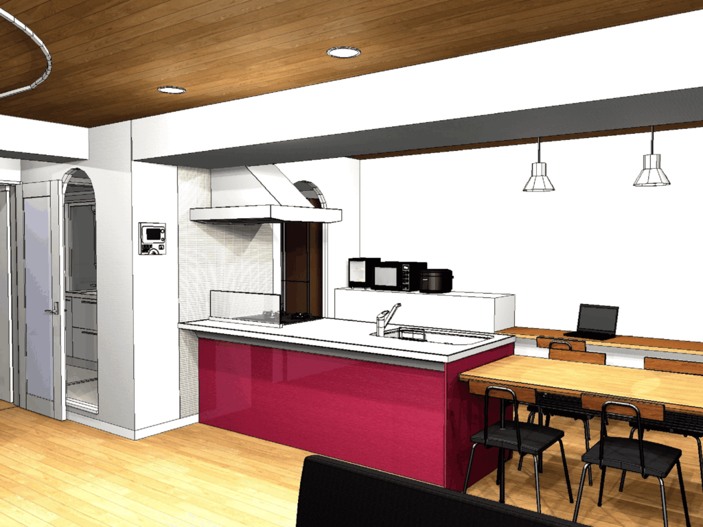 施工着手前にはお客様とお打ち合わせを行い、3Dイメージパースを作成して完成後のイメージをすり合わせます。今回のフルリノベーションでも、LDK・パントリー・洗面をつなぐ回遊動線や、対面キッチンを中心とした空間の広がり、丸みのあるデザインの方向性を視覚的に共有しながら計画を進めました。閉鎖的だったキッチンは、家族との会話が生まれる対面式へと一新し、玄関や土間スペースも広げながら収納力を高めています。