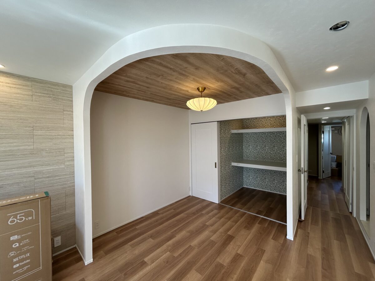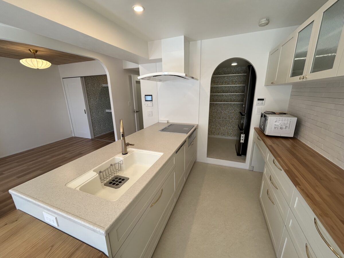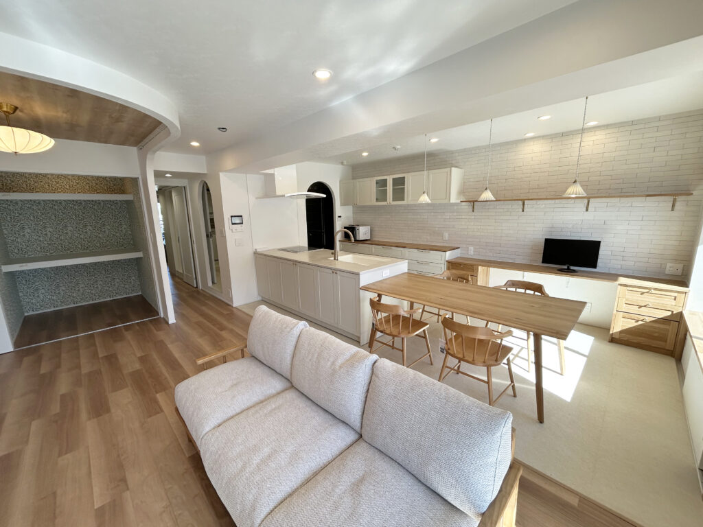 Y様邸では、仕切られていたキッチンを対面式に変え、LDKをカフェのように心地よく、さらに住まい全体を機能的な間取りにしたいというご要望をいただきました。あわせて、丸みのある間仕切りや出入口、木製設備、白い建具、真鍮系の金物を取り入れた、やさしく上品な空間づくりも大切なテーマでした。